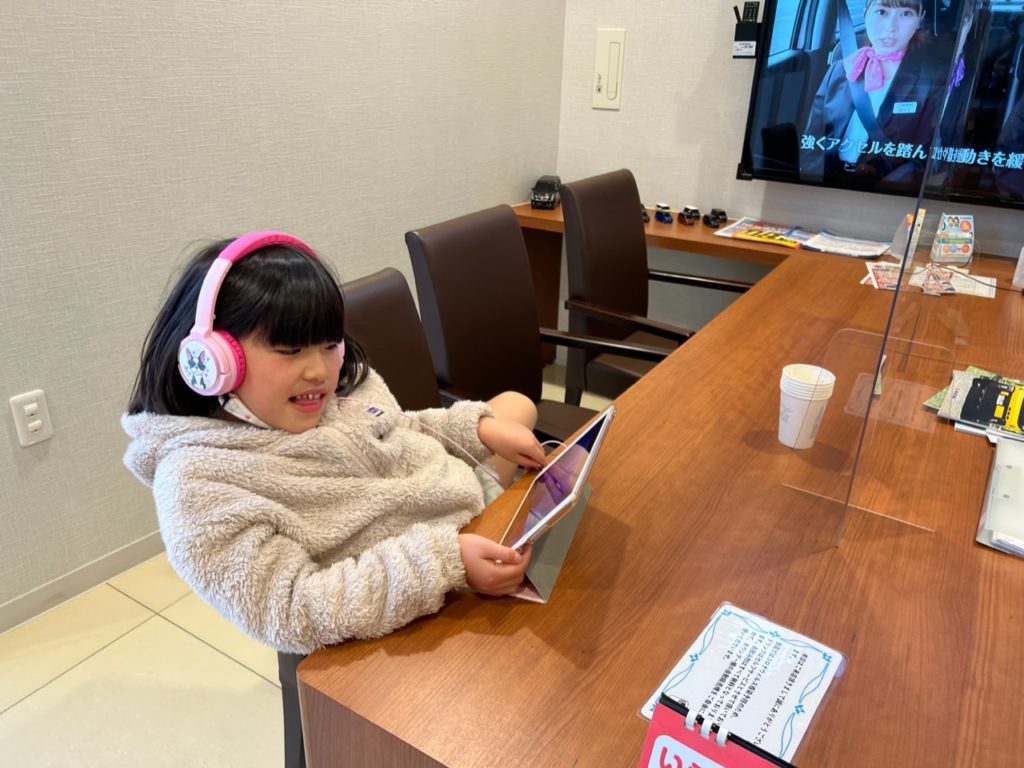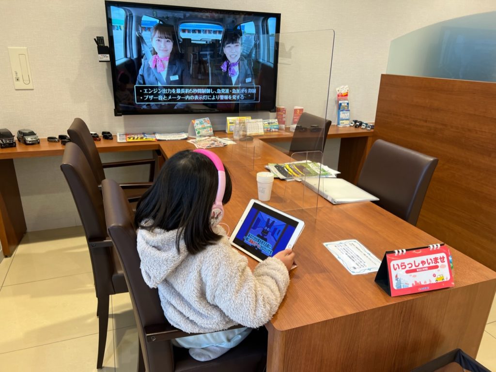 本日1/6(金)始業式の後、検討していた車の試乗をしに伊東市にあるスズキのお店にやって来ました。試乗後スタッフの方とこうすけくんと私が話をしている間めいさんは iPad を見ながらくつろいでいました。