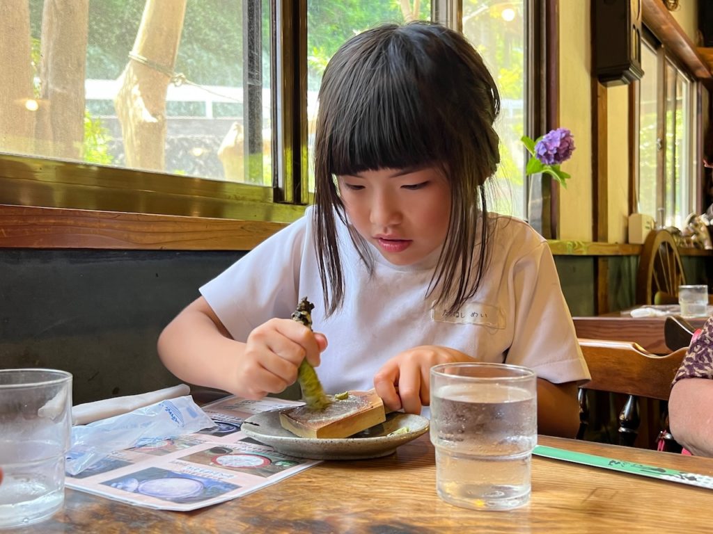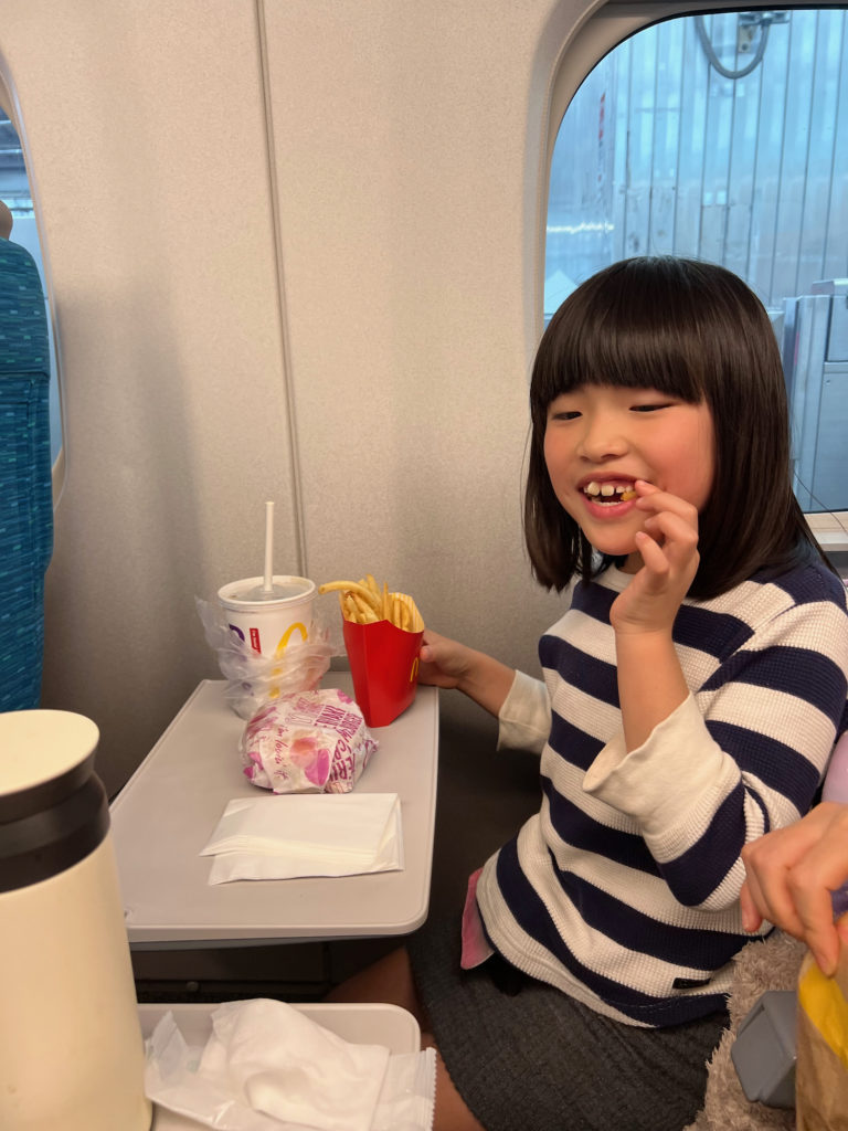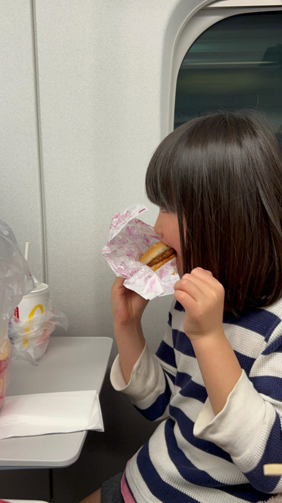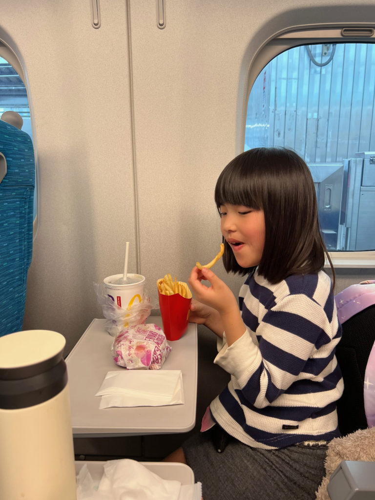 帰りの新幹線、めいさんは前から食べたかったマックを京都駅で買いました。下田のモスバーガーは行ったことあったけど、マクドナルドで1人で1人前を頼むのは初めて。新幹線に乗る前から楽しみすぎて、出発する前にもう食べ始めました。テリヤキバーガーとコーラとポテトを美味しそうに食べてます。