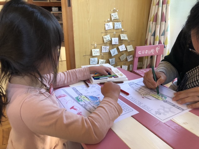 幼稚園から帰ってきて今日はこうちゃんと一緒にぬり絵をして遊びました。