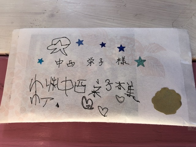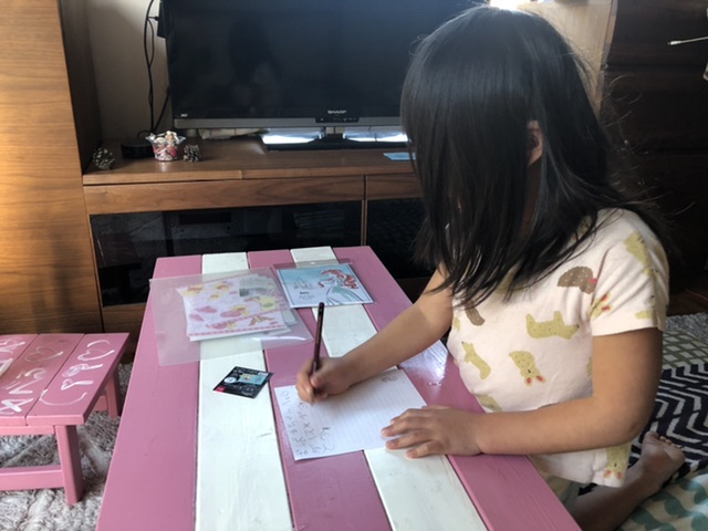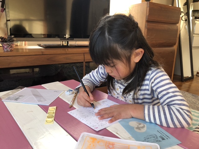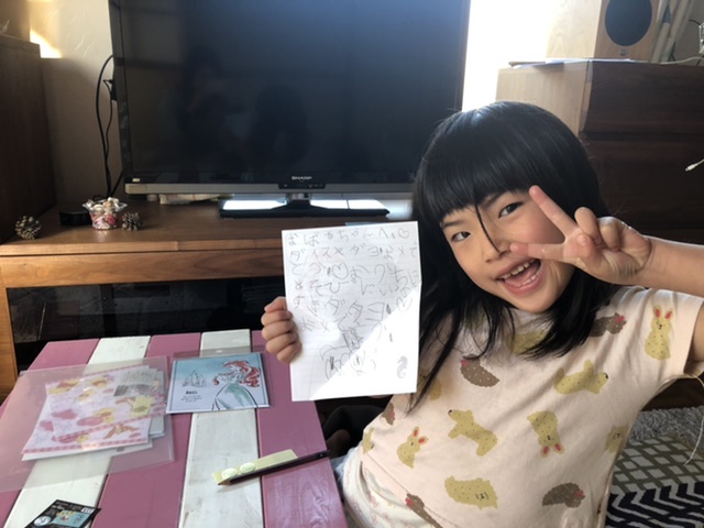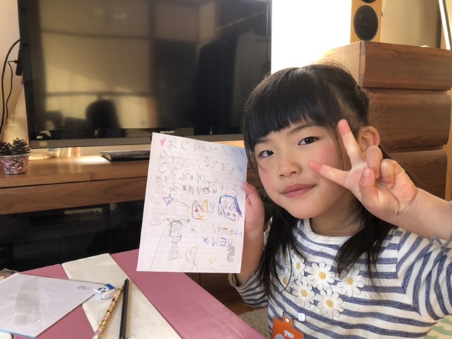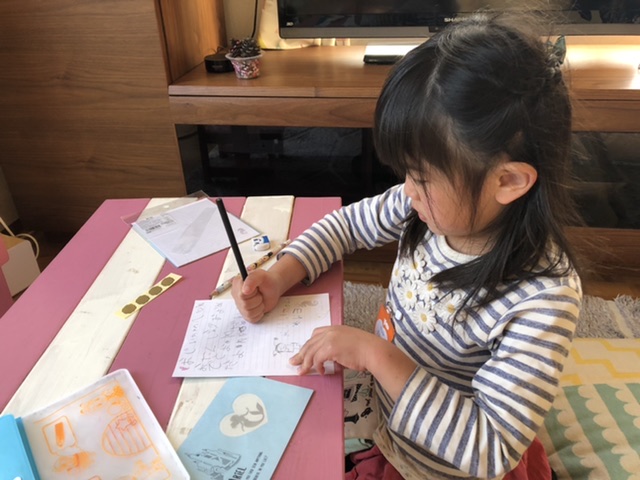 おじいちゃんへお誕生日のお手紙を書いているところです。最近はひらがな帳をあまり見なくても、お手紙(ひらがな)が書けるようになってきました。