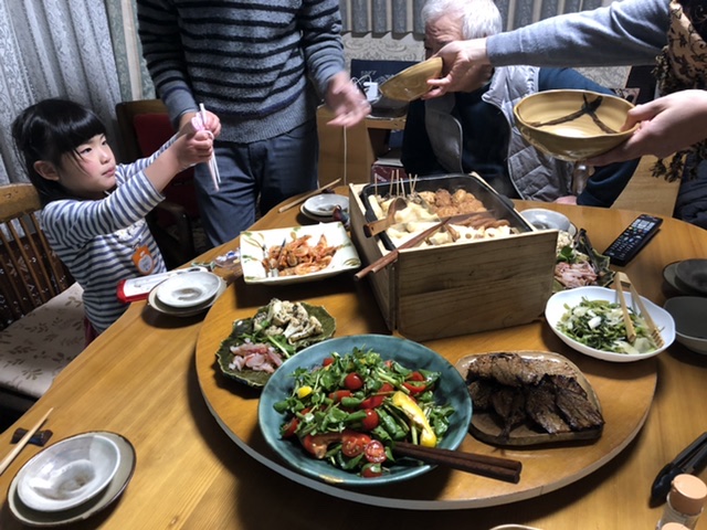 昨夜はご近所さんのおうちで晩ご飯をいただきました。先日おうちに遊びに来てくれた幼稚園のお友達のおじいちゃんおばあちゃんのおうちです。実は最初に干物をお送りした干物屋さんの店主さんでもあり、大家さんの紹介で、11月くらいからこうすけくんがIT関連のサポートをしています。そんなこともあり仲良くさせていただいていて、時々晩ご飯をご馳走になっています。めいさんはなめたけご飯を何度もお代わりして、5杯くらい食べていました。