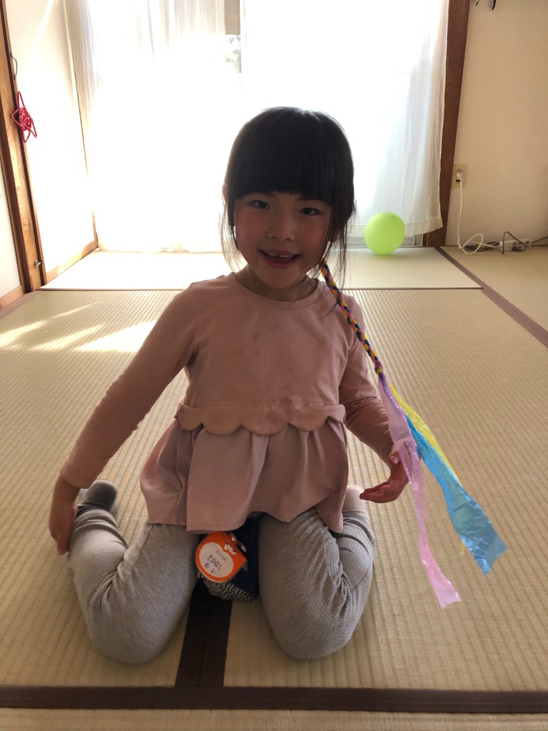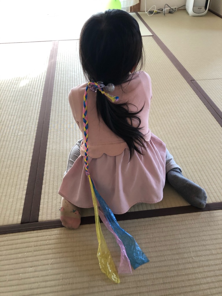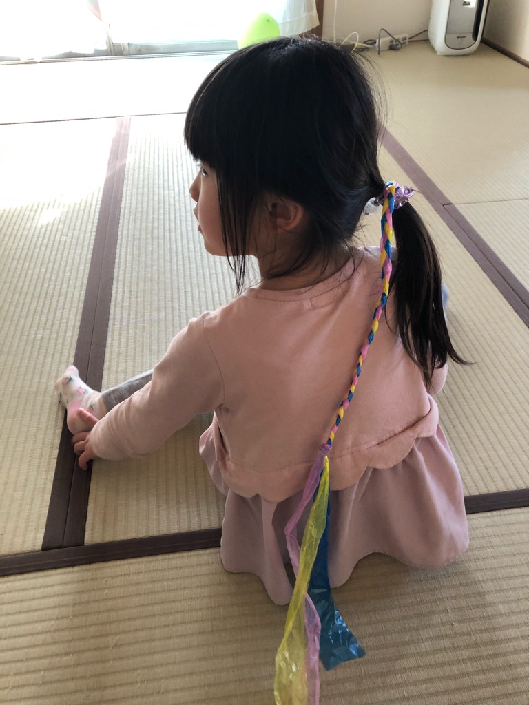 幼稚園で自分で三つ編みのウィッグを作ってきました。(先生に編み方を教えてもらって自分で編んだようです。)可愛らしくてご満足げでした。