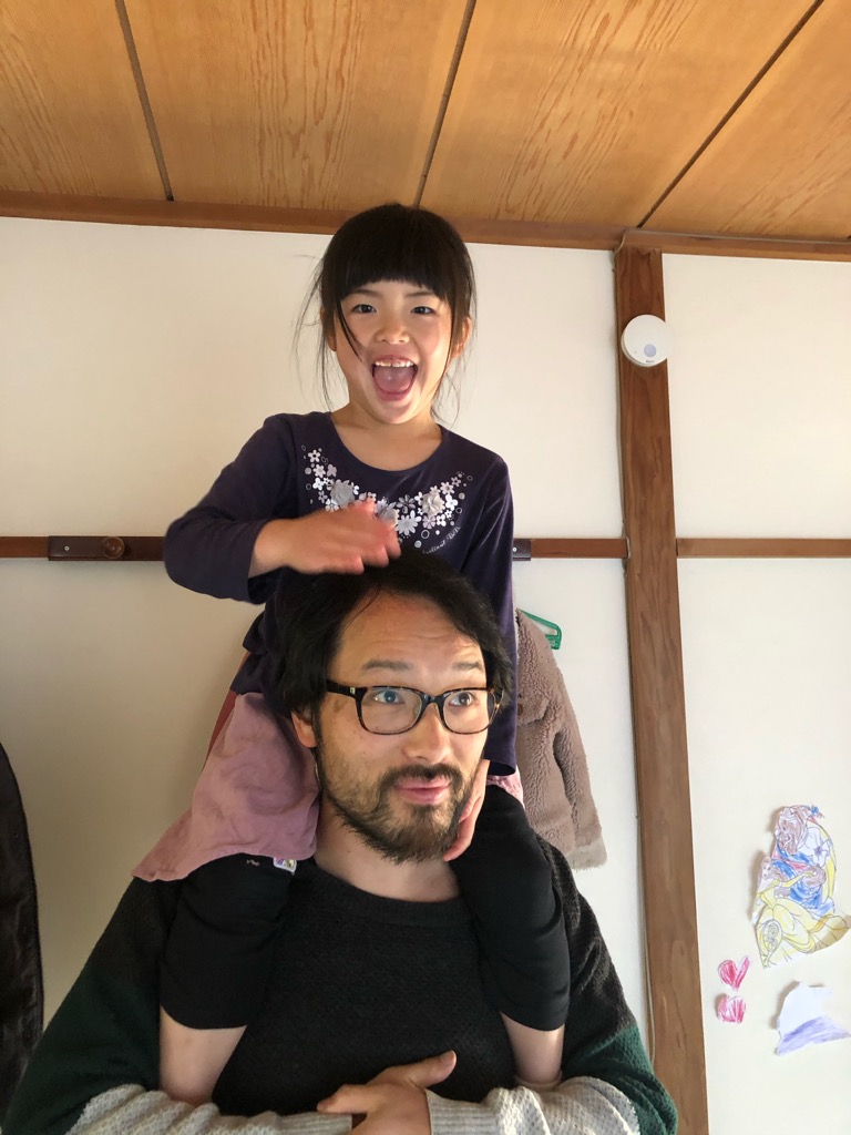 こうすけくんに肩車をしてもらってご機嫌なめいさん。