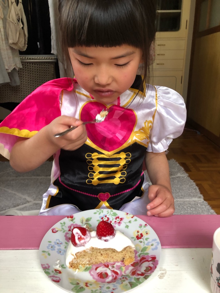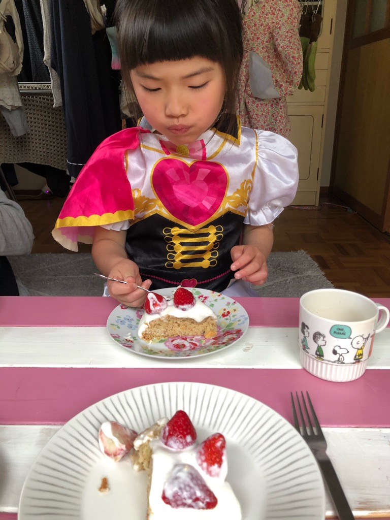 めいさんから、「苺ケーキを作って」というお手紙をもらっていたので、苺ケーキを作ってみました。美味しいと喜んでもらえて良かった。(ファントミラージュのお洋服を着ています♪)
