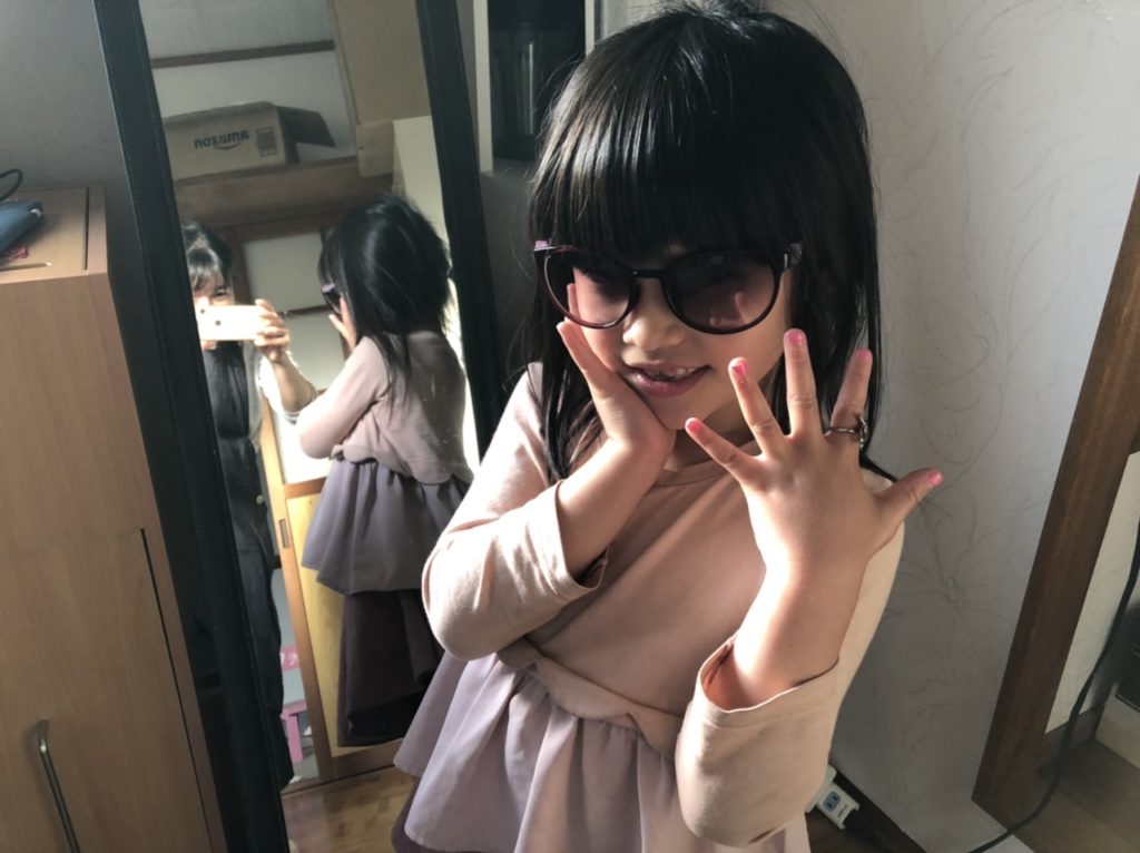 ママのサングラス、水族館で買ったイルカの指輪をつけてポーズを決めています。