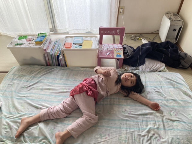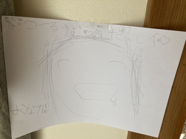 めいさんが自分のキッズルームを作りました。「きっつるうむたのしイ♡」の看板もあります。おなかと書いて、よだれを垂らしているめいさんのお顔。これから美味しいものを食べるんだそうです。