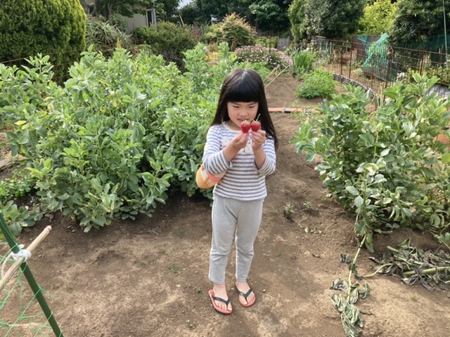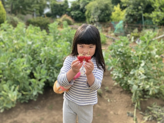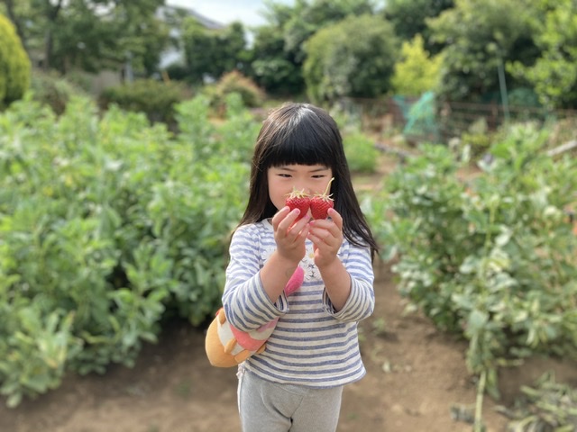 畑で大きな苺を見つけて嬉しそうなめいさん。苺摘みももうお手のもの。この後、こうちゃんにも苺を持っていってあげました。