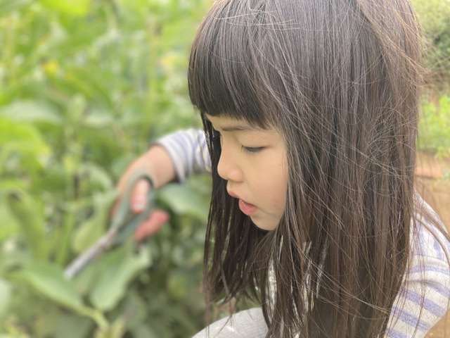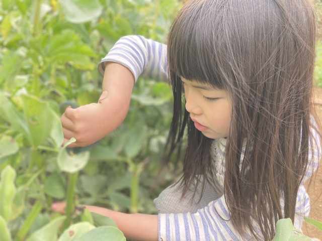 今、畑では空豆がたわわとなっています。めいさんが空豆の収穫のお手伝いをしてくれました。