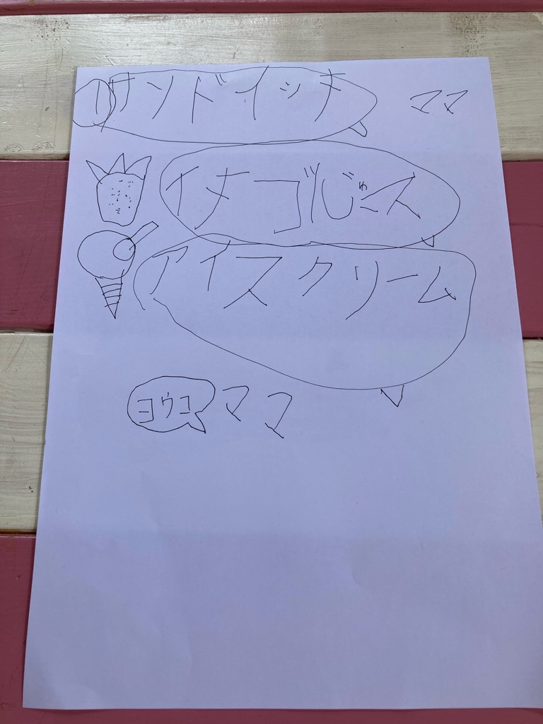 書き順はまだまだだけれどもカタカナも書けるようになってきました。いちごとアイスクリームの絵が可愛い。
