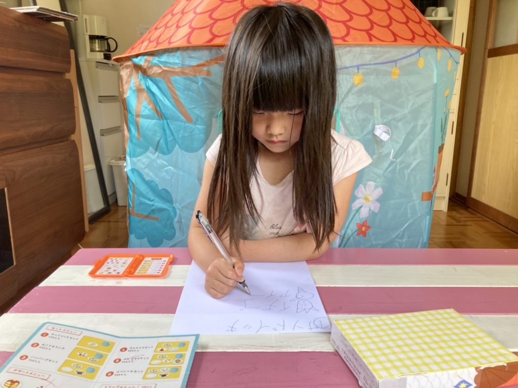 めいさんがレストランの店員さんになって、オーダーを取ったり、お食事をサーブしてくれたりします。オーダーを取るときの表情が真剣です。
