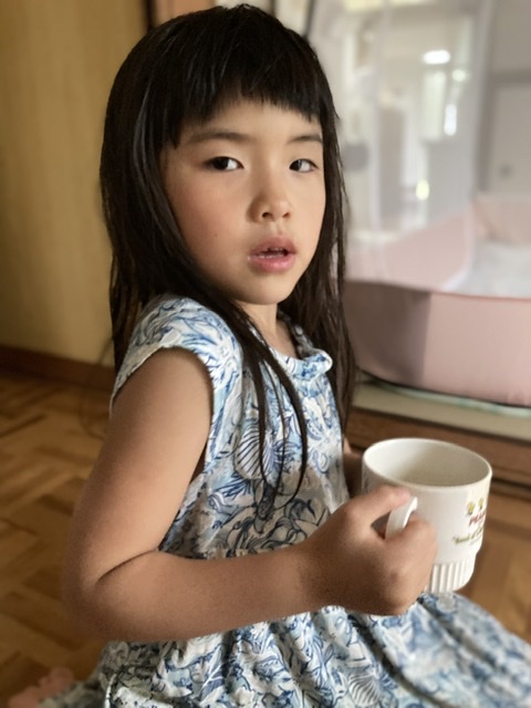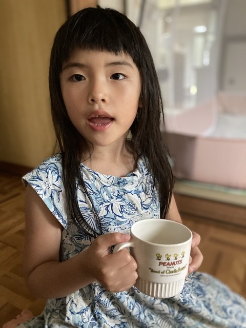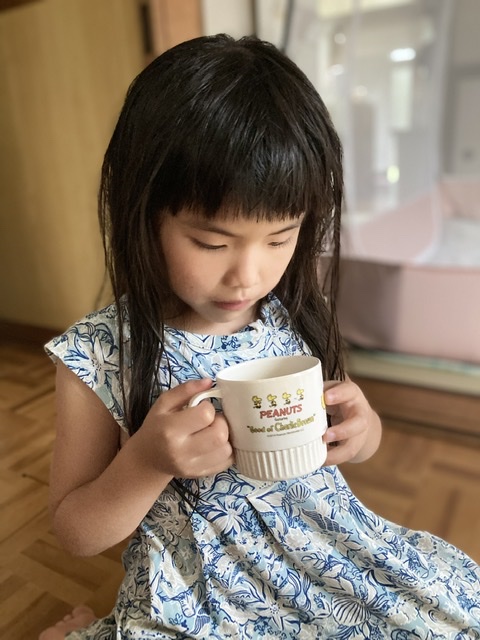 お風呂の後、自家製梅ジュースを飲むのを楽しみにしているめいさん。今日も美味しそうにごくごく飲んでいました。