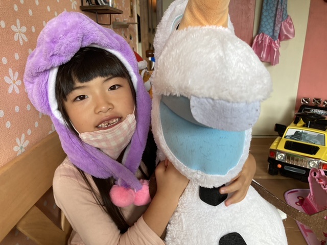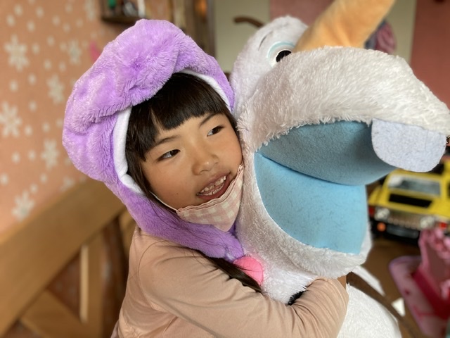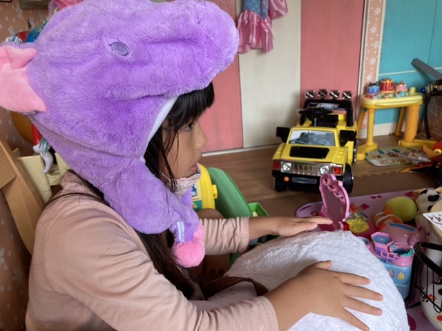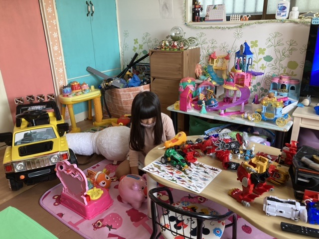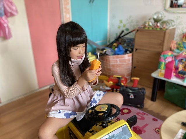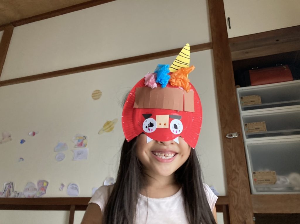一昨日(7/27)めいさんのお洋服やおもちゃ、絵や手紙などの断捨離を一緒にしました。途中、今年の節分に作った鬼のお面を見つけて遊んでいます。