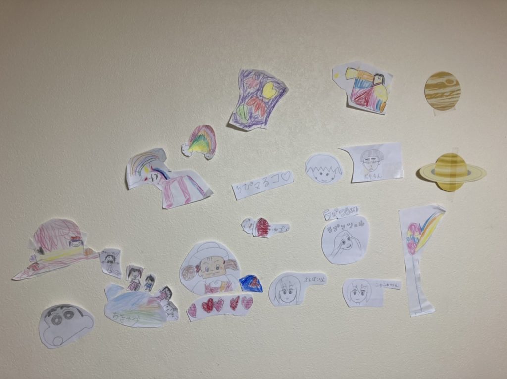 幼稚園でめいさんとお友達が描いた絵、おうちでめいさんとこうすけくんが描いた絵を壁に貼ったらこんな感じになりました。