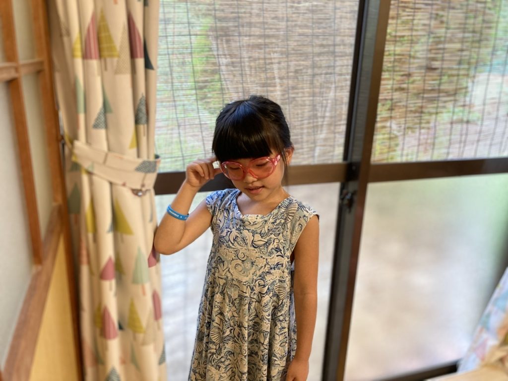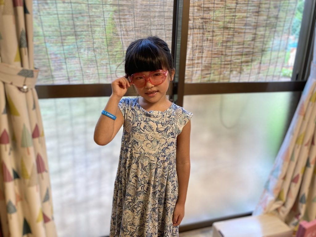 神戸アンパンマンミュージアムでおばあちゃんに買ってもらったドキンちゃんのサングラスをかけて、ちょっと気取っています。お洋服はいつかのお誕生日にいただいたものです。お気に入りでよく着ています。