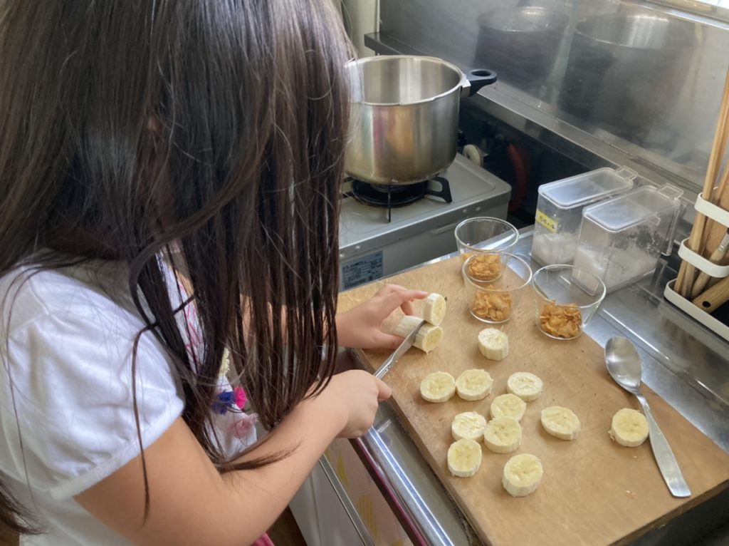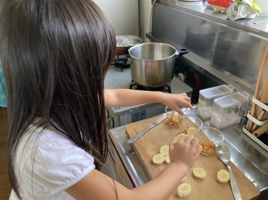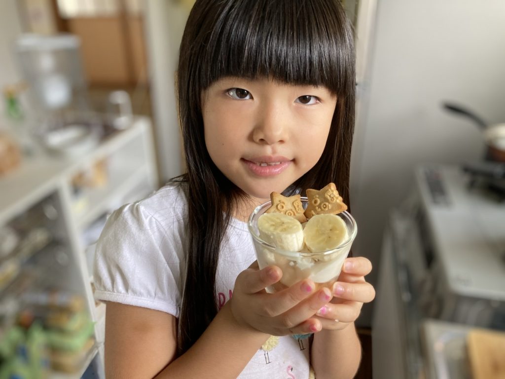 コーンフレークの上にバナナと豆乳ヨーグルトクリームをトッピング。