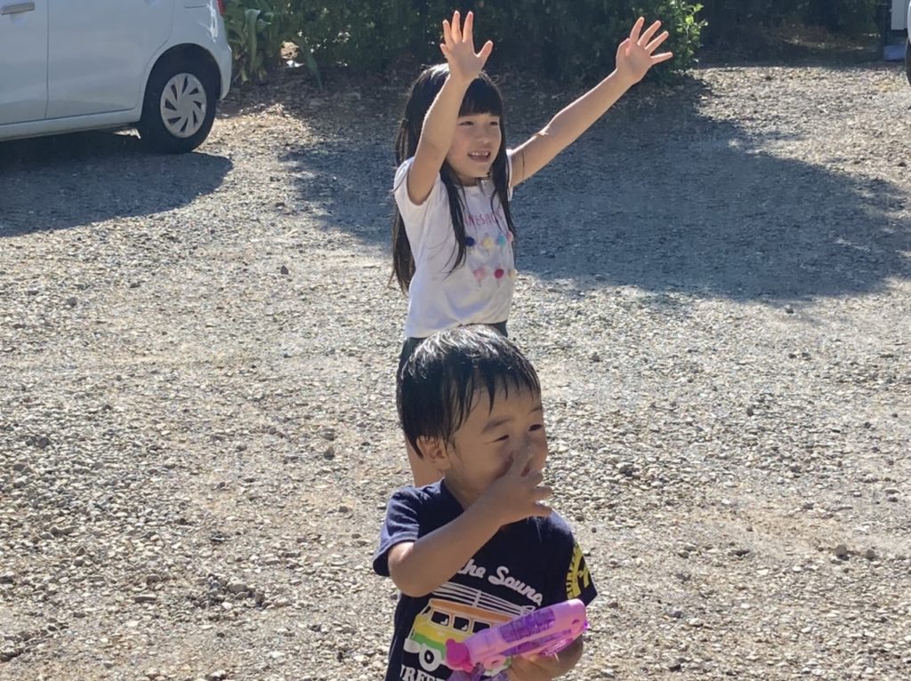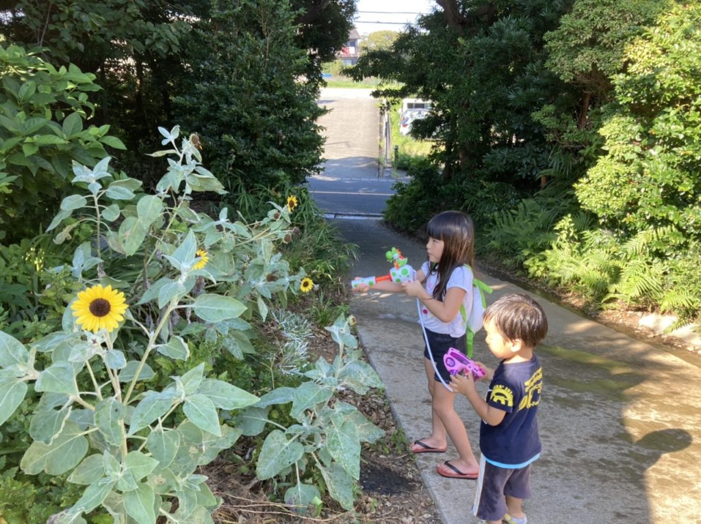 毎日暑いですね。お元気ですか。めいさんは昨日今日と同じ敷地内に住むりまくんと一緒に水遊びを楽しみました。