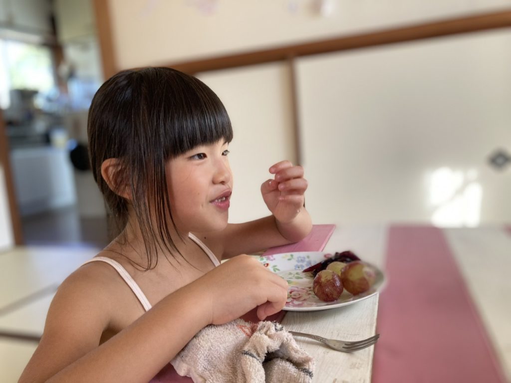 おやつに葡萄を食べました。めいさんは上手に葡萄の皮を剥いています。