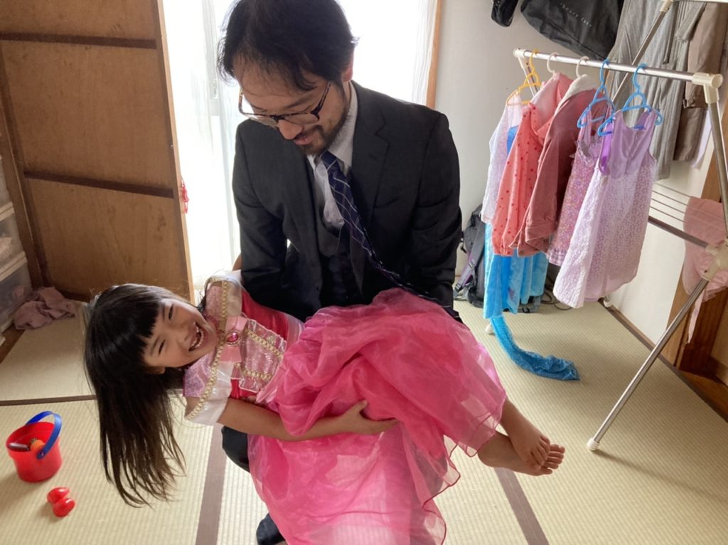 白雪姫と王子様になりきり。王子様役はこうすけくん。王子様っぽくなるように、スーツを着るようめいさんからリクエストが入りました。毒りんごを食べるときのストーリー設定のようです。洗濯物干しがめいさんのドレッサーに様変わりしました。ドレスなどお気に入りのお洋服がかけられています。