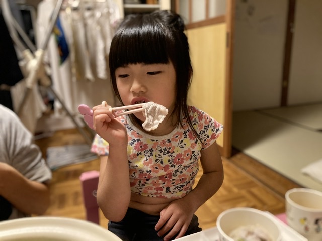 めいさんはお野菜はそこそこに誰よりも沢山お肉を食べていました。