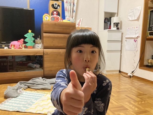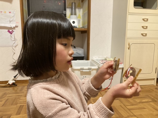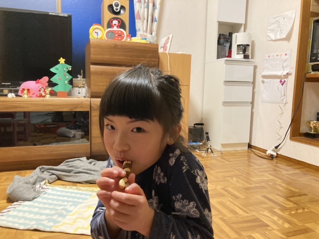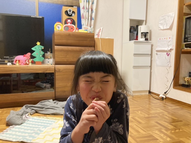クリスマスイヴになったからとずっと食べるのを待っていたユーハイムのサンタさんが描かれたクッキーを開けました。(今まで食べていたのはろうそくのクッキーとバウムクーヘンだけ)