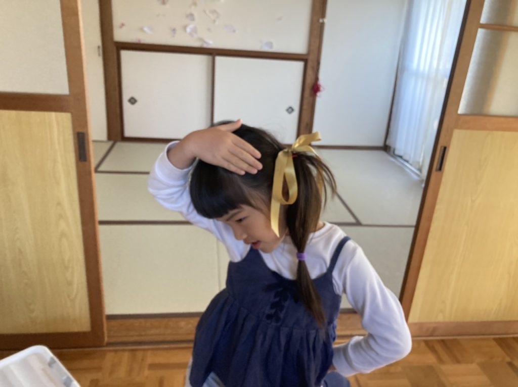 頂いたユーハイムのリボンが可愛らしかったので、今日「幼稚園につけていく!」と言ってリボンをつけていきました。リボン結び以外は全部めいさんが自分で髪を結いました。