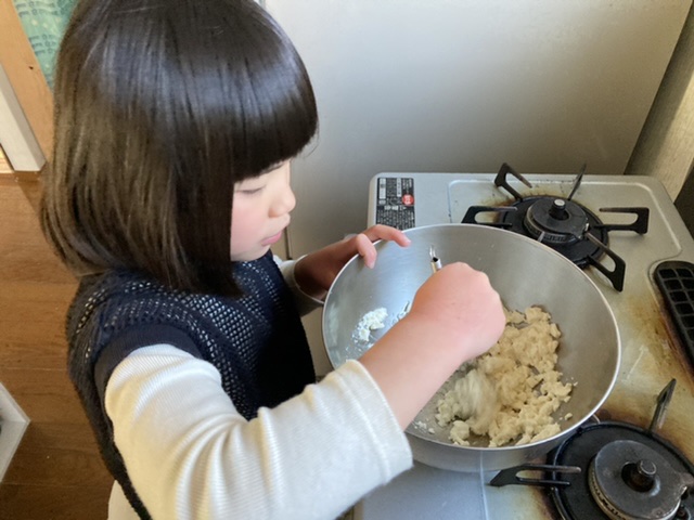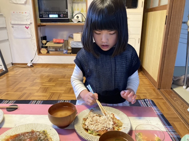 めいさんはお好み焼きが大好きです。こうすけくんのお好み焼きを一番大きく作ったんですが、めいさんが結局こうすけくんのお好み焼きも半分近く食べてしまいました笑
