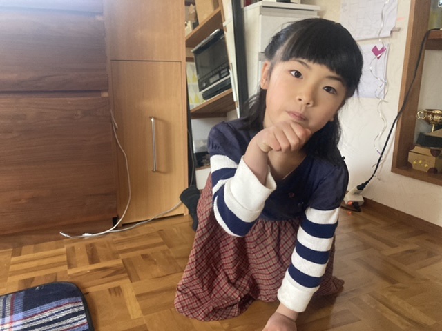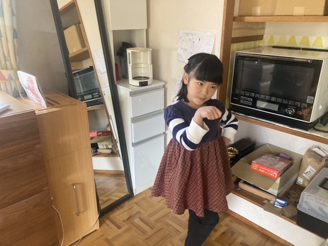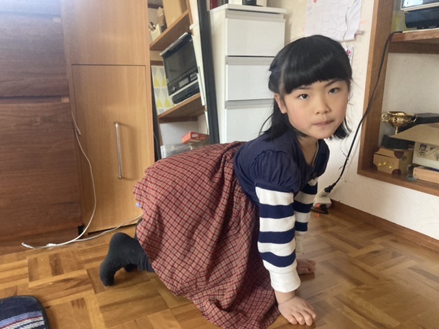 毎日のお洋服はめいさんが自分で選んでいます。今日のコーディネートはこんな感じ。ポーズは猫ポーズです。