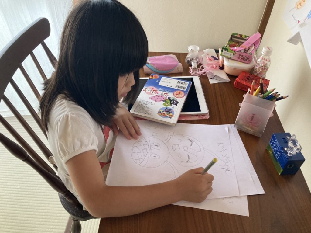いつかのお誕生日にプレゼントしていただいたアンパンマンの絵本を見ながらバイキンマンとドキンちゃんの絵を描いていました。とても上手に描けています。