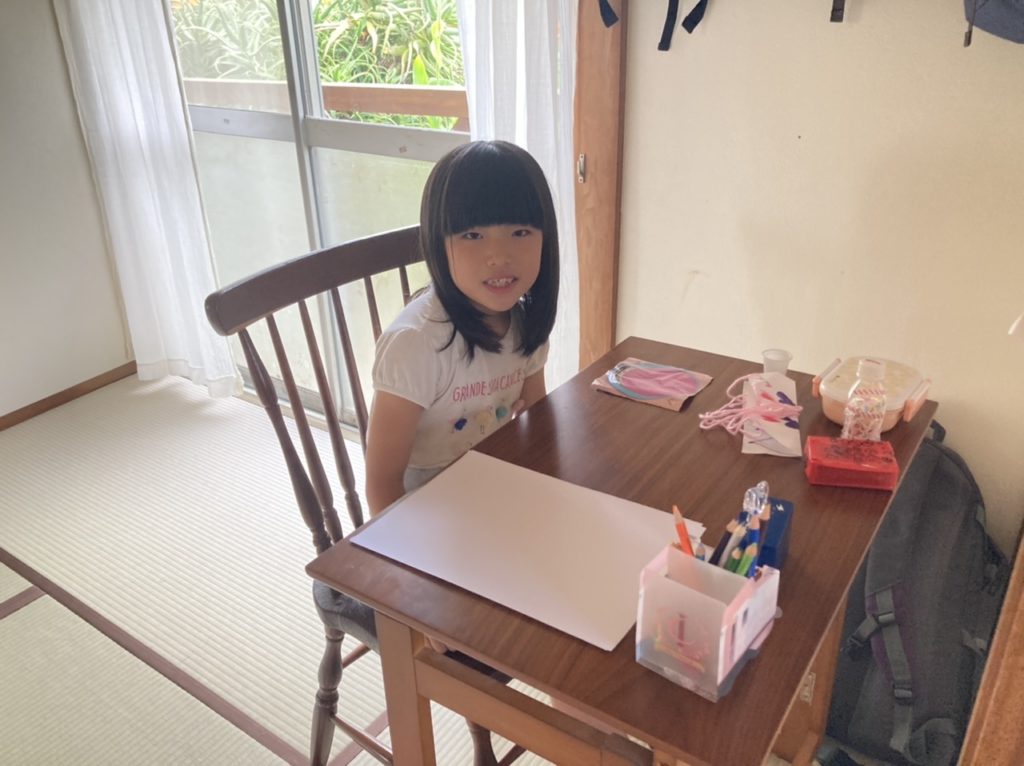 私が普段仕事のときなどに使っているデスクを持ってきて、めいさんがデスクコーナーを作っていました。鉛筆立てやスマホ(めいさんお手製スマホ)も置いています。