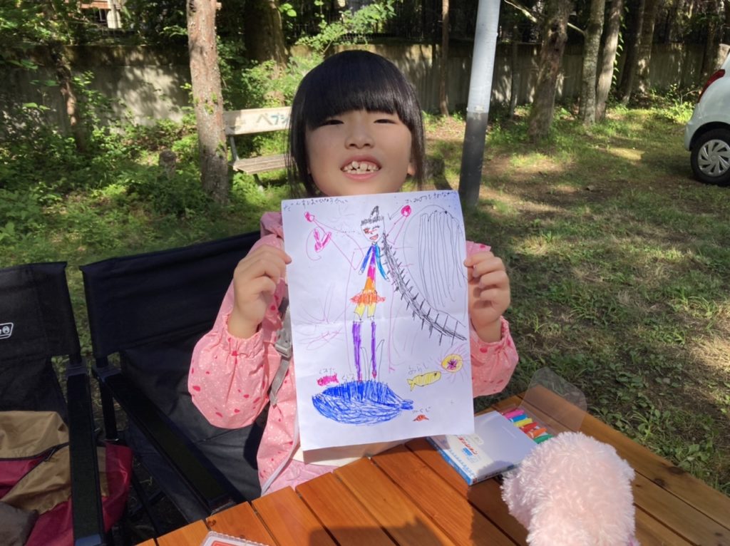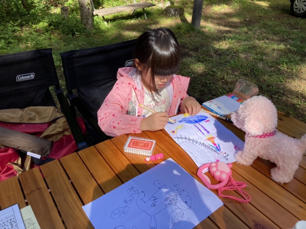キャンプ場で朝ごはんの後、お絵描きを楽しんでいます。お外、気持ちいいね。プレゼントしてもらったワンコちゃんも一緒にキャンプに来ています♪
