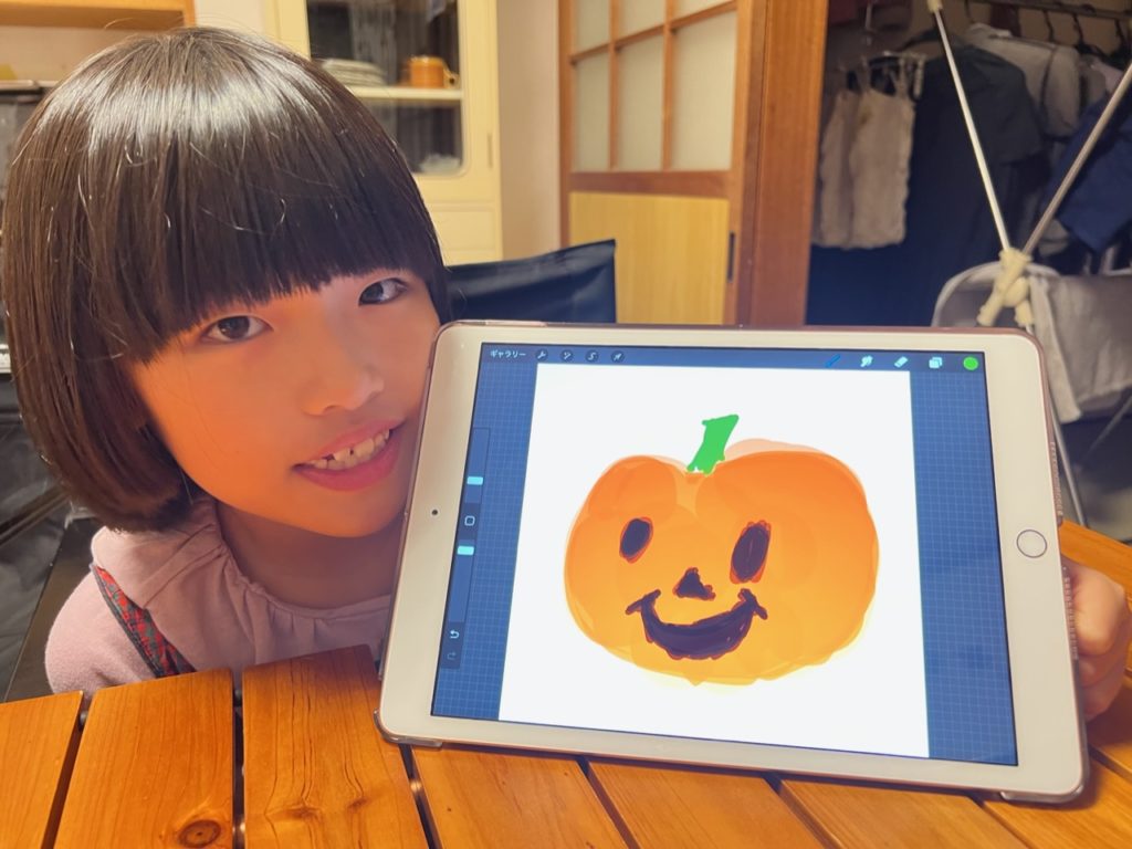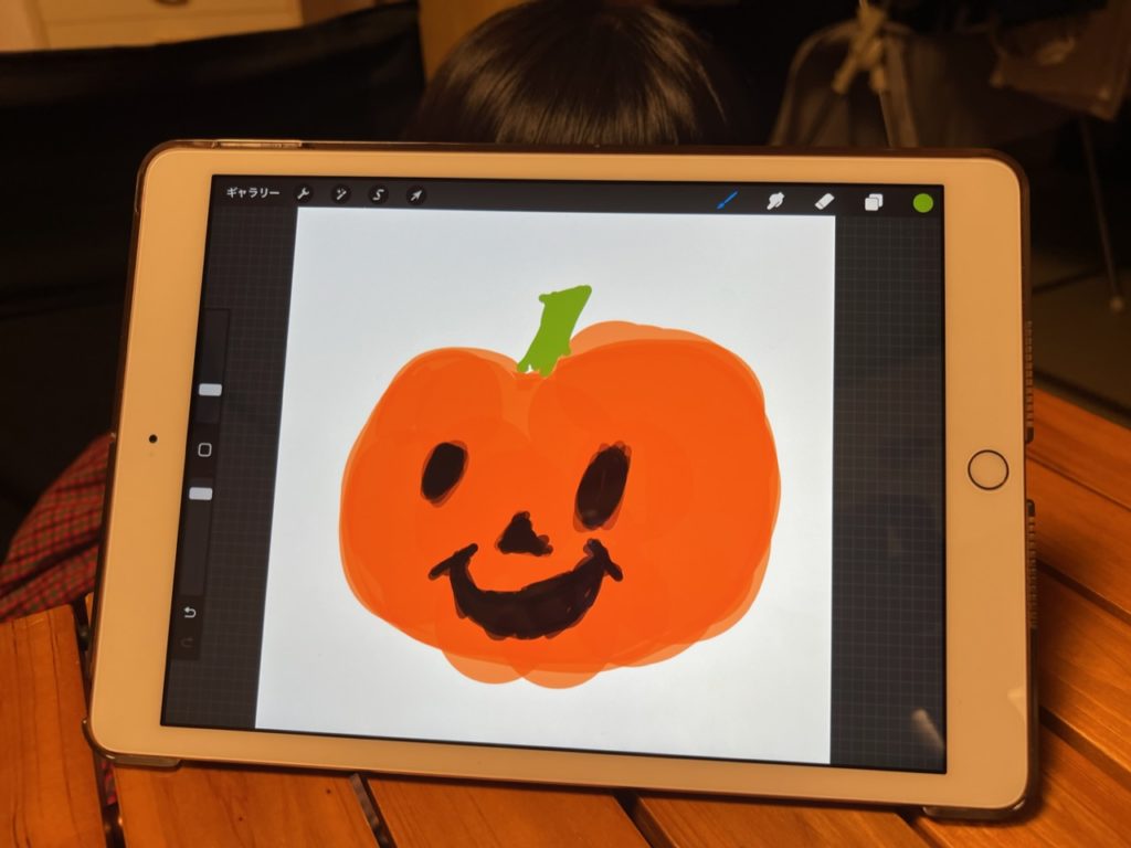 ハロウィンのお菓子の箱が可愛らしかったのでハロウィンをテーマにした絵が描きたくなったみたいです。可愛いハロウィンかぼちゃ。