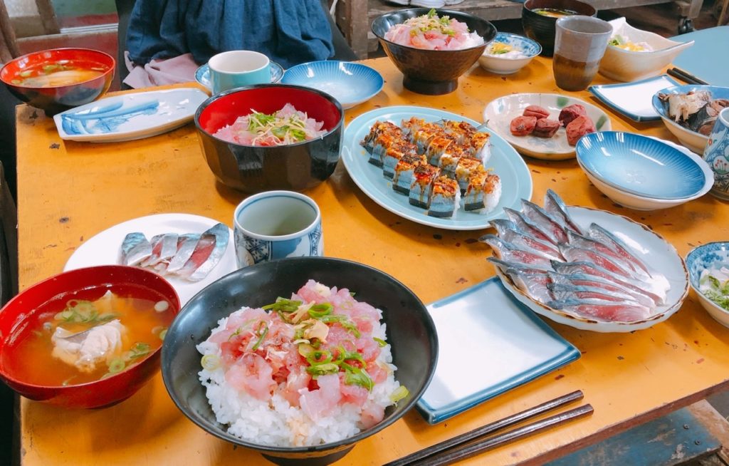 お昼ご飯の時にこうちゃんとめいさんも呼んでもらい、炙りサンマ寿司、しめ鯖、鯖の白子、鯖の煮物、トンボマグロの丼をいただきました。めいさんはいつものごとく炙りサンマ寿司をたくさん頬張っていました。