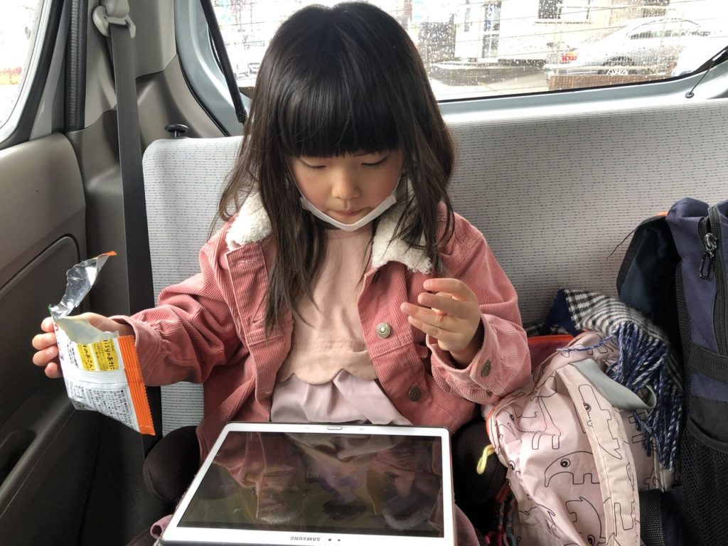 出発直後にお菓子を食べ始めためいさん。普段あまり食べないスナック菓子を食べることができて遠足気分です。