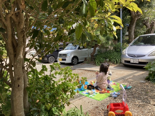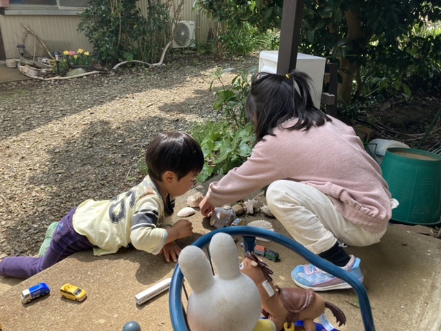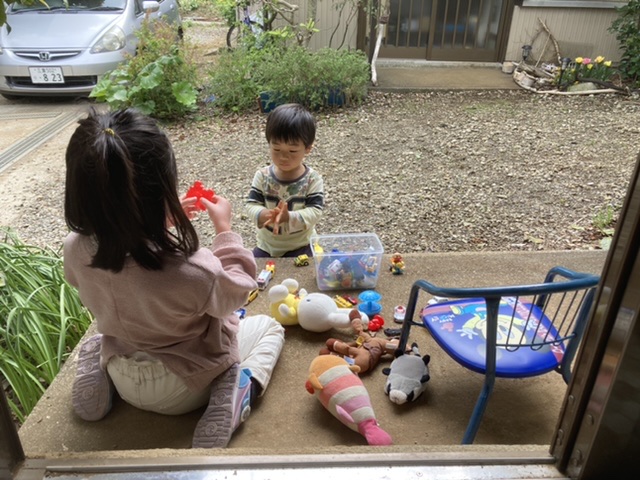 最近りまくんは玄関先にやってきて、「めいちゃん、あそぼー」とお誘いしてくれます。それぞれおもちゃを持ち寄って遊んでいます。